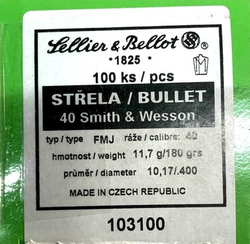 S & B c.40 S&W 180GR FMJ 100 PACK (Bullet ONLY)